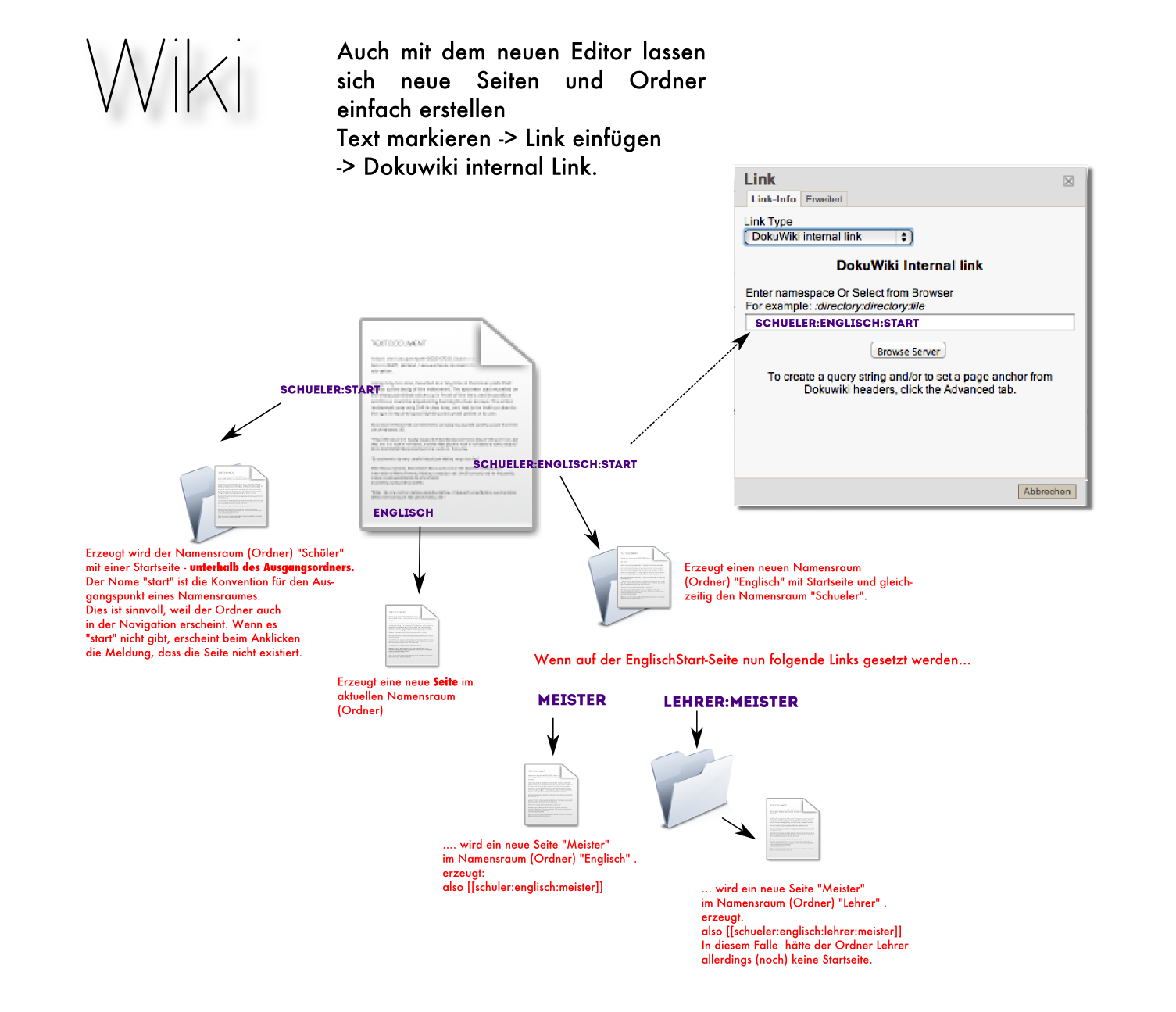 Die Zugriffsrechte vererben sich. Wenn also ein neuer Namensraum (Unterordner) im Bereich „Lehrerintern“ erstellt wird, ist dieser auch nur für Lehrer zugänglich. Ebenso gilt dies für neue Seiten oder Namensräume, die unterhalb öfffentlicher Bereiche erstellt werden - auch diese sind dann öffentlich zugänglich.